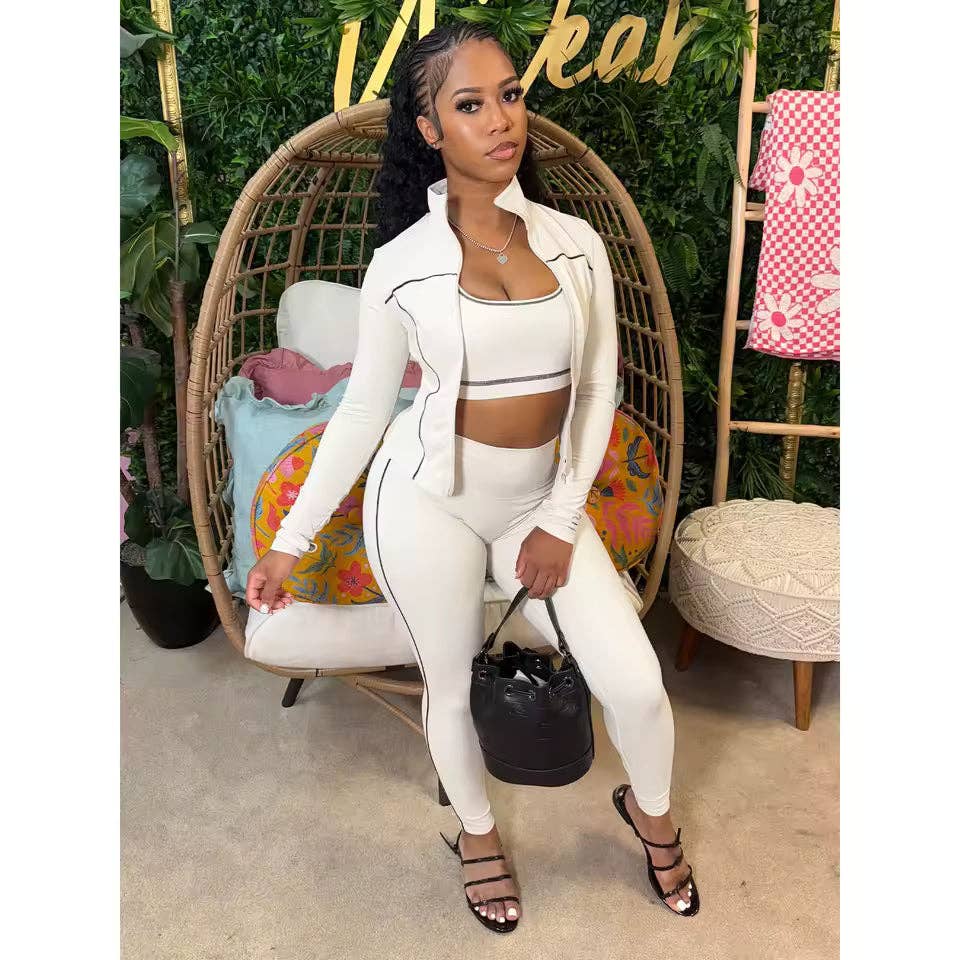 Elevate your workout style with this sleek 3-piece activewear set designed for performance and everyday wear. The set includes a supportive sports bra, high-waist leggings, and a lightweight zip-up jacket that provides the perfect balance of comfort and function.