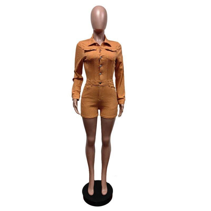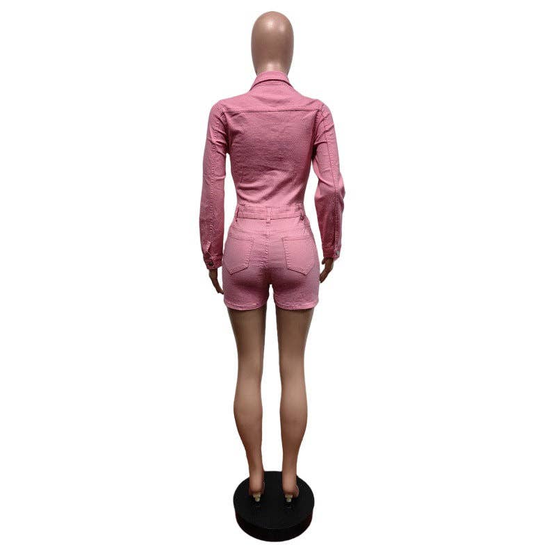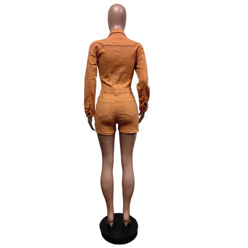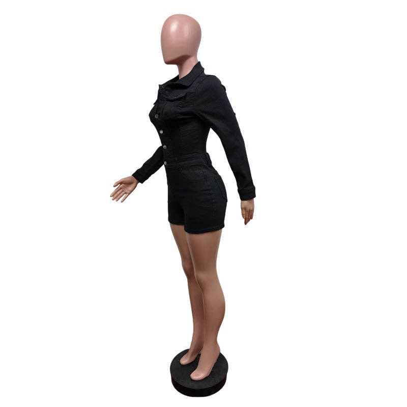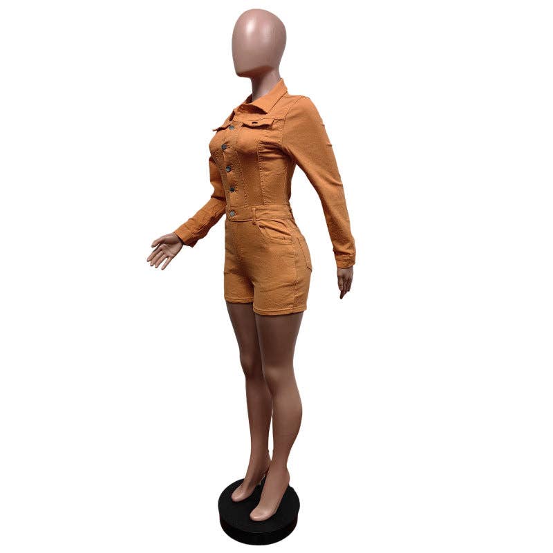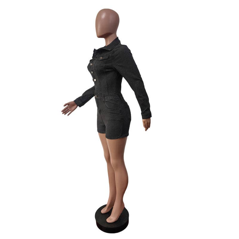 Step up your fashion game with this must-have MB FASHION Long Sleeve Button-Up Denim Romper 8622LY. Structured and sleek, this fitted romper boasts long sleeves, a button-up front, and a collared neckline for a tailored and refined look. Complete with chest flap pockets, a defined waist, and elongating short bottoms, this versatile and bold piece is perfect for any occasion. Don't miss out on adding this edgy wardrobe essential to your collection.