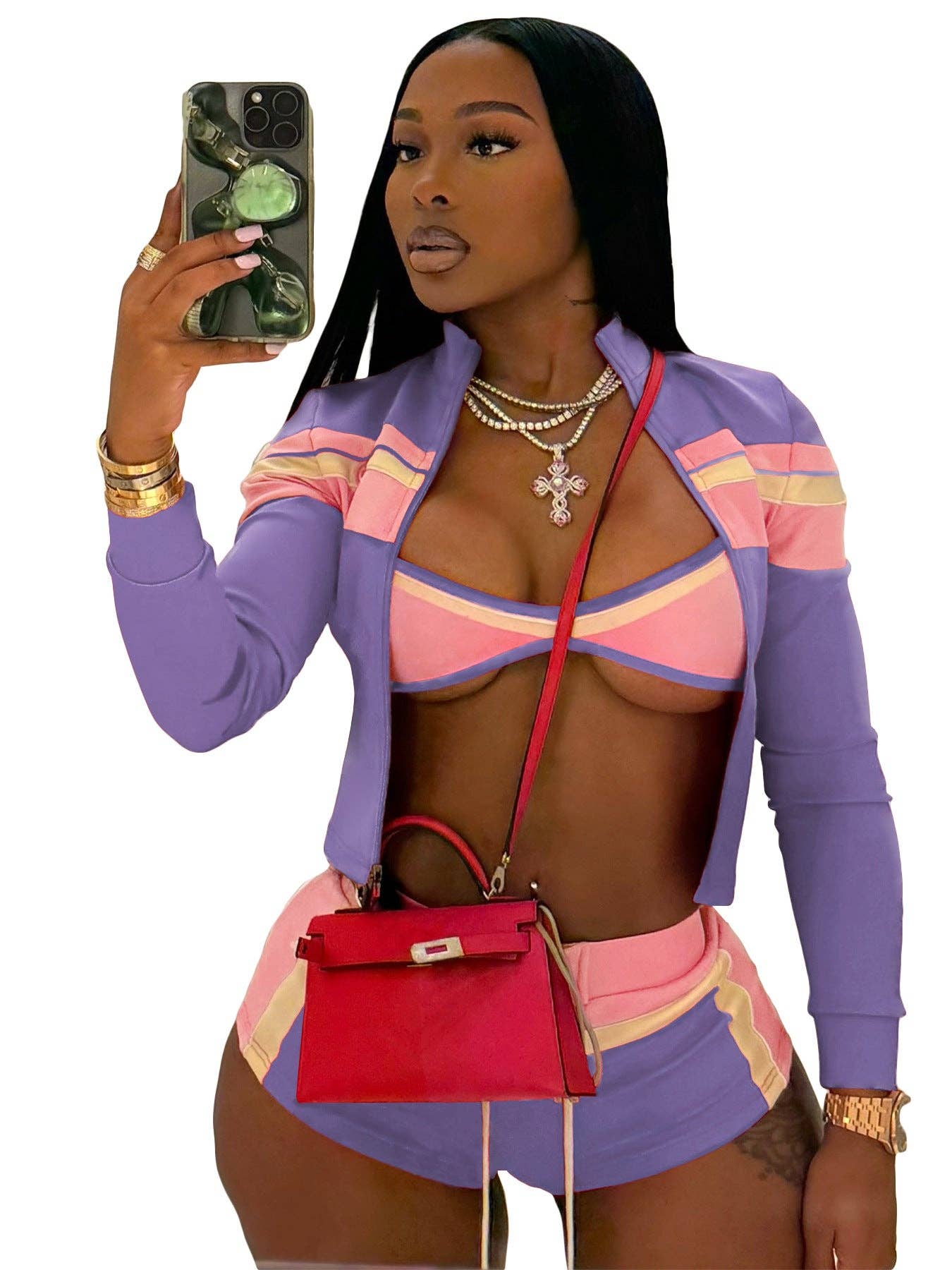Three-piece set: zip-up jacket, crop top, and high-rise shorts